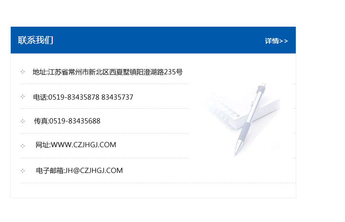 傳真:0519-83435688    郵編:213135    網址:WWW.czjhgj_com.huada-pack.com    電子郵箱:JH@czjhgj_com.huada-pack.com